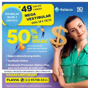 Olá Parceiro(a) , seja bem vindo! Prazer, sou a Flavia consultora educacional da faculdade Estácio. Estou passando de primeira mão para divulgar o nosso Mega Vestibular que será dia 18